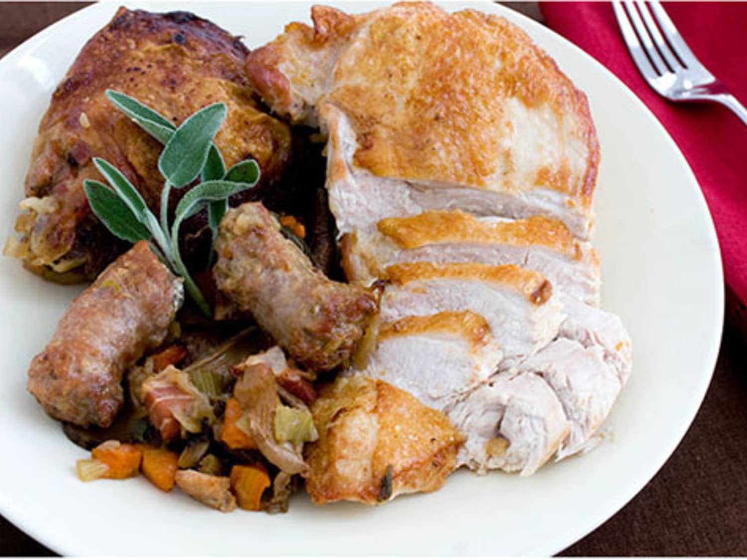 Be sure to leave some room for the turkey thighs. Roast for a little over one hour and once the thickest part of the meat reaches 165 degrees remove from the oven and let it sit for about 20 minutes before carving it up. Start with the turkey breast skin side up on top of the stuffing or vegetables. 1 8 to 10-pound turkey cut into 5 parts breast legs wings giblets removed and discarded.