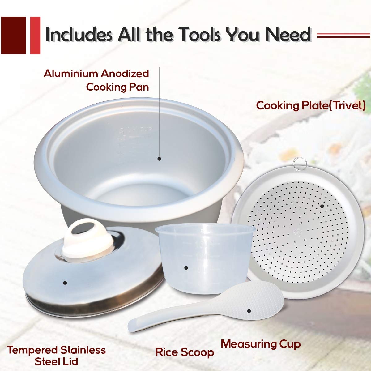 Fluff the rice with a rice paddle and serve with another recipe of your choice. To use simply add rinsed rice or another ingredient like couscous polenta or quinoa and water into the 25-liter pot then top with a pressure chamber plate and snap on the lid. Refer to the manual which comes along with the induction friendly rice cooker to adjust the temperature if needed. When the rice is done the switch flips to off.